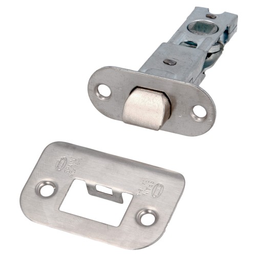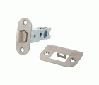 Picaporte de embutir. Frente redondo y soporte con cantos redondeados con film protector. Para pomos y manillas de roseta con tornillos pasantes con cuadradillo de 8 mm en puertas de madera de paso.