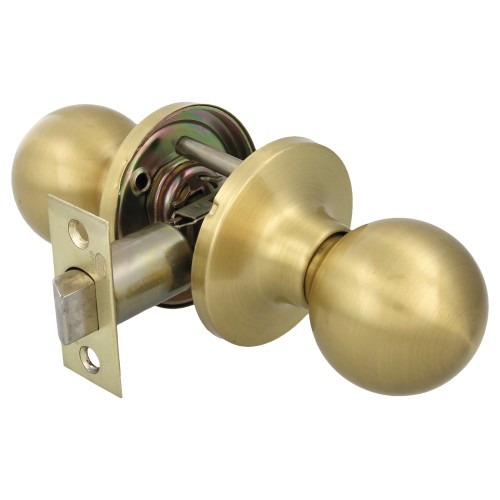 Juego de pomos tipo bola de latón con picaporte de entrada 60/70 mm incluido. Picaporte de canto cuadrado.Función Paso: la manilla se acciona libremente de ambos lados. Para puertas de madera de anchura de 35 a 45 mm.
