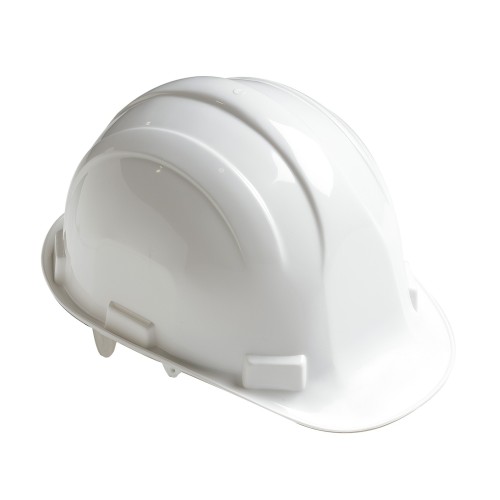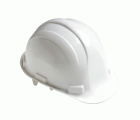 Casco en polipropileno (PP) con cinta de sudoración. Con ranuras para adaptar auriculares. Arnés de polietileno y ajuste por presión con 4 puntos de anclaje. Norma EN397. Peso: 325 g. Para obra.