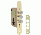 Cerradura auxiliar de embutir para puertas de madera. Con bulones de cierre de acero cromado. Canto redondo. Caja cerrada y mecanismo interior de acero bicromatado. Frente y soporte en acero. Sin picaporte. Desplazamiento 20 mm (2 vueltas). Entrada: 50 mm.