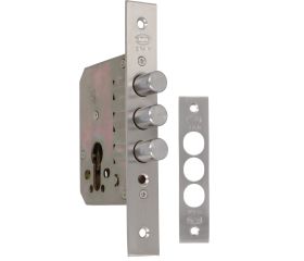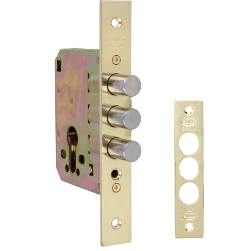 Cerradura auxiliar de embutir para puertas de madera. Con bulones de cierre de acero cromado. Canto cuadrado.Caja cerrada y mecanismo interior de acero bicromatado. Frente y soporte en acero. Sin picaporte. Desplazamiento 20 mm (2 vueltas). Entrada: 50 mm.