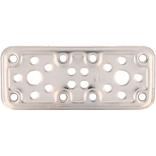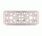 INFORMACIÓN TÉCNICA DETALLADA: La placa mide 120 x 50 x 2.2 mm y cuenta con múltiples orificios avellanados para un anclaje más seguro. Puede soportar las cargas y condiciones ambientales sin deteriorarse.