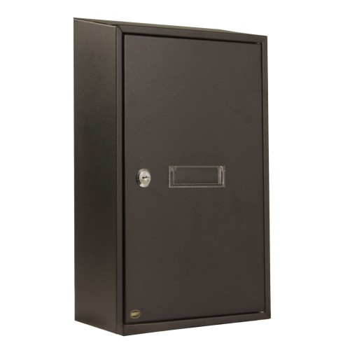 - Recogecartas de acero en color negro con apertura posterior para colocar en interior de puertas, ventanas, verjas o muros. En el paquete se incluyen tornillos, tirafondos y una llave en bruto de latón niquelado. Gracias a su fondo de 10 cm, tiene buena capacidad para recoger grupos de hojas y sobres de tamaño medio.