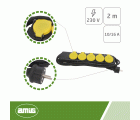 Base múltiple Schuko con toma de tierra. Longitud del cable: 2 m. Cable 3G 1,5 mm². Sin interruptor. Estanqueidad IP44. Amperaje máximo: 10/16 A. Voltaje máximo: 230 V.