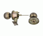 Juego de pomos tipo latón bola con picaporte de entrada 60/70 mm incluido. Picaporte de canto cuadrado. Función Privado, con dispositivo de emergencia en el exterior y condena en el interior: con la condena se bloquea el sistema y con el dispositivo de emergencia exterior se libera. Para puertas de madera de anchura de 35 a 45 mm.