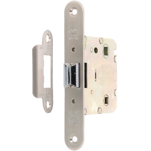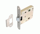 Picaporte unificado de entrada 50 mm con lengüeta reversible. Frente y soporte en canto redondo. Para manillas de roseta con tornillos pasantes y cuadradillo de 8 mm y condenas de 6 mm. Distancia entre nuecas: 47 mm. Largo frente: 135 mm. Ancho frente: 20 mm. Giro manilla: 23º. Máximo tornillo M5: distancia 40 mm. Para puertas de madera de paso o de baño.