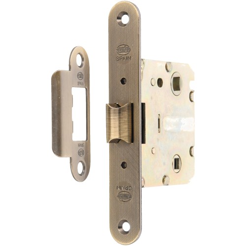 Picaporte unificado de entrada 50 mm con lengüeta reversible. Frente y soporte en canto redondo. Para manillas de roseta con tornillos pasantes y cuadradillo de 8 mm y condenas de 6 mm. Distancia entre nuecas: 47 mm. Largo frente: 135 mm. Ancho frente: 20 mm. Giro manilla: 23º. Máximo tornillo M5: distancia 40 mm. Para puertas de madera de paso o de baño.