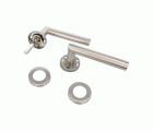 Juego de manillas de acero inoxidable 18/8 con roseta. Cuadradillo de 8 mm. Incluye accesorios de fijación.