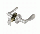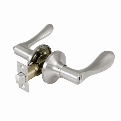 Juego de manillas con picaporte de entrada 60/70 mm incluido. Picaporte de canto cuadrado. Función Privado, con dispositivo de emergencia en el exterior y condena en el interior: con la condena se bloquea el sistema y con el dispositivo de emergencia exterior se libera. Para puertas de madera de anchura de 35 a 45 mm.