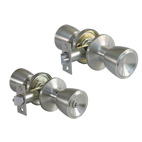 - Este juego de 2 pomos cuenta con llave exterior y pomo giratorio en el interior. Con picaporte de canto cuadrado para puertas de 60/70 mm de grosor y roseta de 65 mm de diámetro.