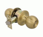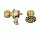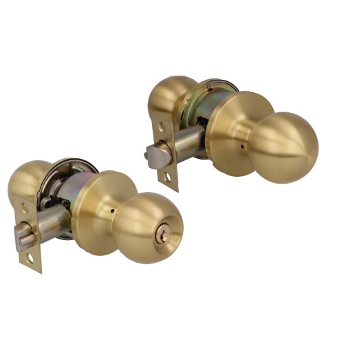 Juego de pomos tipo bola de latón con picaporte de entrada 60/70 mm incluido. Picaporte de canto cuadrado con sistema antitarjeta. Función Hotel, con llave exterior: el sistema se libera solo con la llave, pero por el interior siempre está libre. Llave en bruto modelo 5100. Para puertas de madera de anchura de 35 a 45 mm.