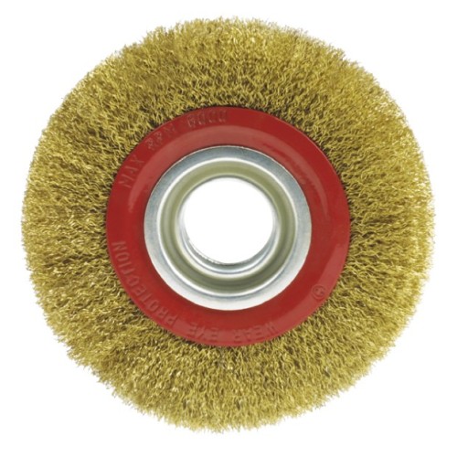 Cepillo circular de alambre de acero latonado con adaptador multieje. Eliminación de óxidos, pinturas, cascarillas y limpieza de piezas. Solo para uso en máquinas fijas.