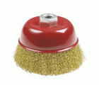 Cepillo de vaso de alambre de acero latonado con casquillo roscado M14. Para grandes superficies en calderería y construcción. Uso con herramientas portátiles.