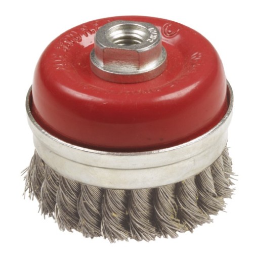 Cepillo de vaso de alambre trenzado templado con casquillo roscado M14. Para grandes superficies. Gran arranque en calderería y construcción.