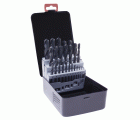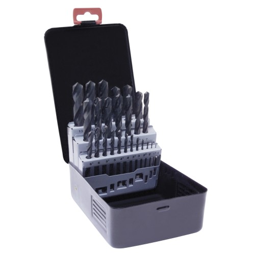 Estuche metálico con 25 brocas para metal en acero rápido. Serie corta. Mango cilíndrico y punta de 118º. Rectificada. Materiales de dureza hasta 800 N/mm², acero y fundición de acero.