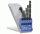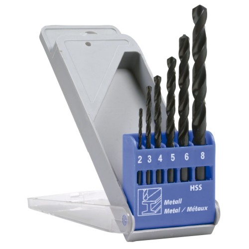 Estuche de plástico con 6 brocas para metal en acero rápido. Serie corta. Mango cilíndrico y punta de 118º. Rectificada. Materiales de dureza hasta 800 N/mm², acero y fundición de acero.