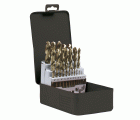 Estuche metálico con 25 brocas para metal en acero rápido. Serie corta. Mango cilíndrico y punta de 118º. Rectificada. Aceros aleados y no aleados de dureza superior a 850 N/mm². Aceros templados y revenidos y aceros inoxidables.