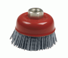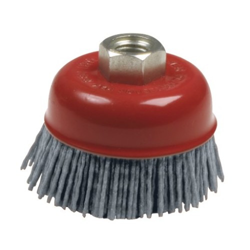 Cepillo de vaso de nylón abrasivo (carburo de silicio) con casquillo roscado M14. Limpieza de superficies de madera, metálicas sin rayaduras, acero inoxidable, superficies de piedra y hormigón.