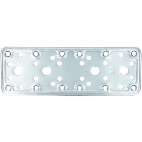 INFORMACIÓN TÉCNICA DETALLADA: La placa mide 185 x 65 x 2.2 mm y cuenta con múltiples orificios avellanados para un anclaje más seguro. Puede soportar las cargas y condiciones ambientales sin deteriorarse.