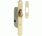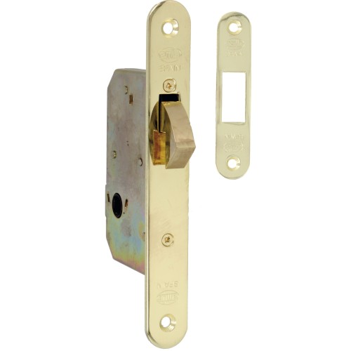Cerradura de embutir para puertas correderas de madera. Canto redondo. Frente y soporte en acero. Alojamiento para muletilla de 8 mm.