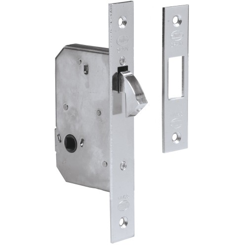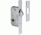 Cerradura de embutir para puertas correderas de madera. Canto cuadrado. Frente y soporte en acero. Alojamiento para muletilla de 8 mm.