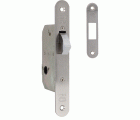 Cerradura de embutir para puertas correderas de madera. Canto redondo. Frente y soporte en acero. Alojamiento para muletilla de 8 mm.