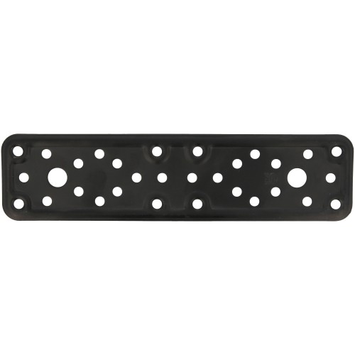 INFORMACIÓN TÉCNICA DETALLADA: La placa mide 200 x 50 x 2.2 mm y cuenta con múltiples orificios avellanados para un anclaje más seguro. Puede soportar las cargas y condiciones ambientales sin deteriorarse.