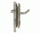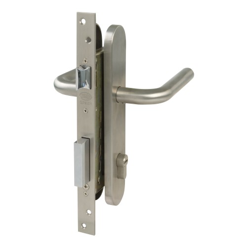 Kit formado por: 1 juego de manillas modelo 4PXB85 en acero inoxidable 18/8. 1 cerradura modelo 200 acero inoxidable. 1 cilindro de seguridad modelo 9850-60 (30-30) mm latón cromo mate. Para puertas de carpintería de madera. Sobre encargo.
