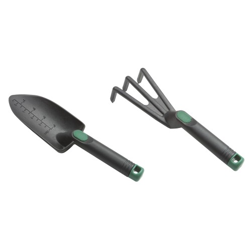 Kit de jardinería en nylón negro. Incluye: 1 x pala ancha modelo 214 y 1 x escarificador modelo 244.