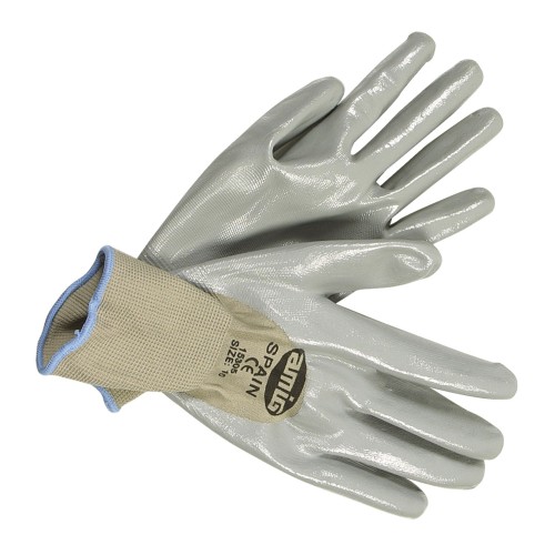 Guante mixto de nitrilo gris sobre nylon gris. Con recubrimiento en la palma de la mano y medio dorso. Para riesgos mecánicos. Norma: EN420 - EN388. Para manipulación de precisión, piezas pequeñas y montajes. Mayor protección en medios aceitados.