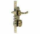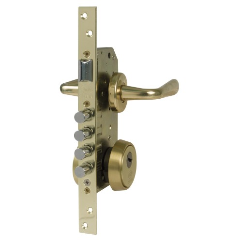 1 Juego de manillas modelo 252R de latón. 1 cerradura modelo 100 de latón. 1 Escudo de seguridad modelo 31 latón mate. 1 Bocallave de latón mate. 1 Cilindro de seguridad modelo 9850-60 (30-30) mm latón mate. Para puertas de carpintería de madera. Sobre encargo.