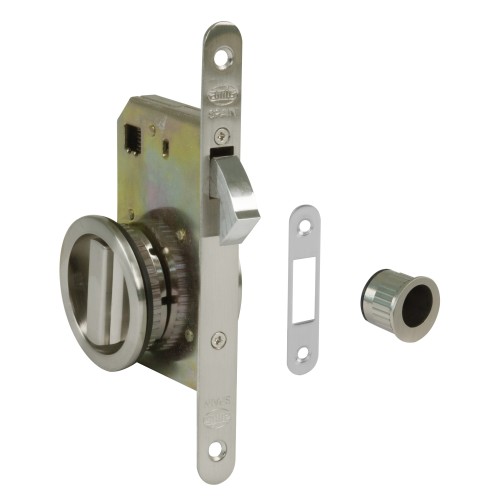 Cerradura de embutir para puertas correderas de madera. Canto redondo. Frente y soporte en acero. Entrada: 50 mm. Incluye muletilla con desbloqueo y tirador frontal. Para puertas de espesor entre 35 y 40 mm.