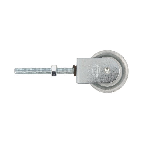 Polea para tendedero con cuerpo fabricado en acero zincado. Roldana metálica de Ø 39 mm con canal de 8 mm. Montaje mediante tornillo de M6 con arandela y tuerca incluida.