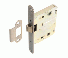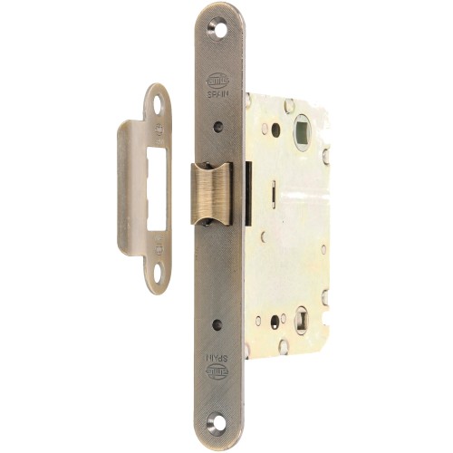 Picaporte unificado de entrada 50 mm con lengüeta reversible. Frente y soporte en canto redondo. Para manillas de roseta con tornillos pasantes y cuadradillo de 8 mm y condenas de 6 mm. Distancia entre nuecas: 70 mm. Largo frente: 158 mm. Ancho frente: 20 mm. Giro manilla: 27º. Máximo tornillo M5: Distancia 38-40 mm.