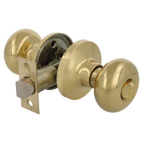 Juego de pomos tipo bola chata con picaporte de entrada 60/70 mm incluido. Picaporte de canto cuadrado. Función Privado, con dispositivo de emergencia en el exterior y condena en el interior: con la condena se bloquea el sistema y con el dispositivo de emergencia exterior se libera. Para puertas de madera de anchura de 35 a 45 mm.