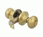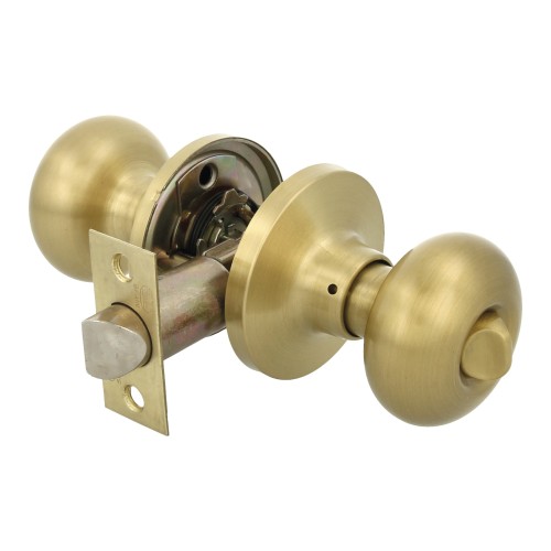 Juego de pomos tipo bola chata con picaporte de entrada 60/70 mm incluido. Picaporte de canto cuadrado. Función Privado, con dispositivo de emergencia en el exterior y condena en el interior: con la condena se bloquea el sistema y con el dispositivo de emergencia exterior se libera. Para puertas de madera de anchura de 35 a 45 mm.