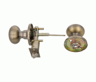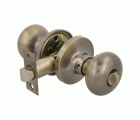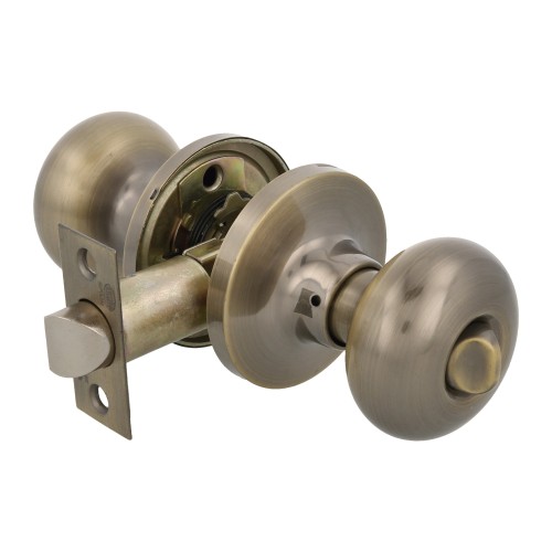 Juego de pomos tipo bola chata con picaporte de entrada 60/70 mm incluido. Picaporte de canto cuadrado. Función Privado, con dispositivo de emergencia en el exterior y condena en el interior: con la condena se bloquea el sistema y con el dispositivo de emergencia exterior se libera. Para puertas de madera de anchura de 35 a 45 mm.