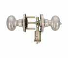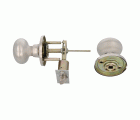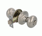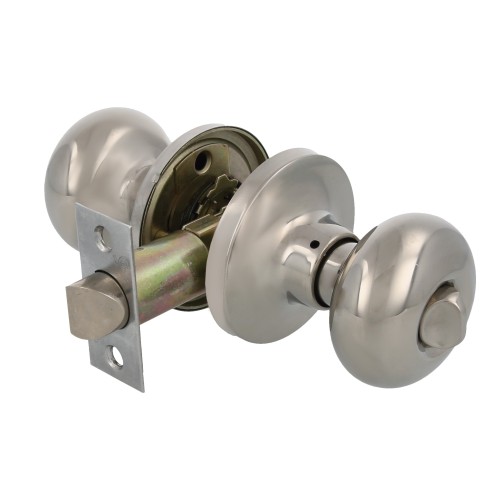 Juego de pomos tipo bola chata con picaporte de entrada 60/70 mm incluido. Picaporte de canto cuadrado. Función Privado, con dispositivo de emergencia en el exterior y condena en el interior: con la condena se bloquea el sistema y con el dispositivo de emergencia exterior se libera. Para puertas de madera de anchura de 35 a 45 mm.
