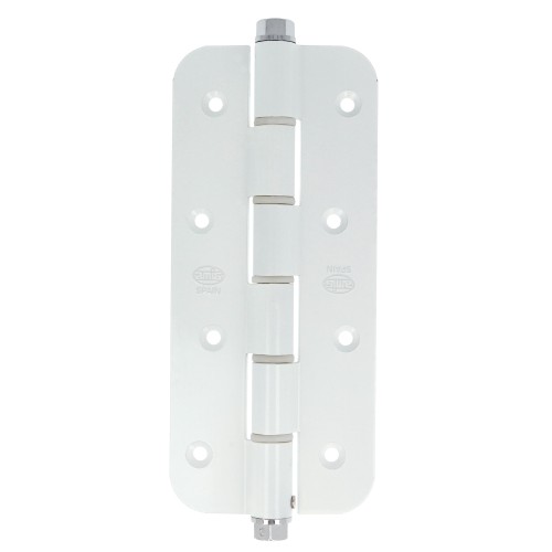 Bisagra de simple acción con canto redondo. Muelle de acero elástico flexible para cierre automático de puertas. Regulación de potencia de cierre, incluye llave Allen. Gran resistencia a la torsión.