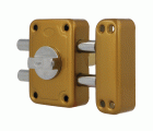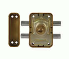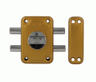 Cerradura de sobreponer para puertas de madera. Con cilindro redondo de seguridad y 5 llaves de puntos. Longitud cilindro: 50 mm. Con 2 bulones de cierre y muletilla interior. Llave en bruto modelo 5000.
