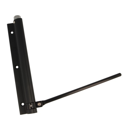 Pernio muelle con brazo en acero pintado. Muelle de acero elástico flexible para cierre automático de puertas. Regulación de potencia de cierre, incluye llave Allen. Soporte de nylon negro. Para puertas ligeras, máximo: 40 kg.