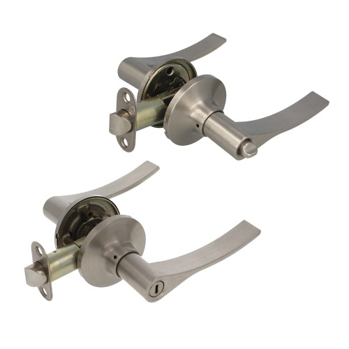 Juego de manillas con picaporte de entrada 60/70 mm incluido. Picaporte de canto redondo. Función Privado, con dispositivo de emergencia en el exterior y condena en el interior: con la condena interior se bloquea el sistema, pero con el dispositivo de emergencia exterior se libera. Para puertas de madera de anchura de 35 a 45 mm.