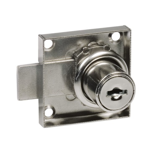 Cerradura de mueble fabricada en acero al carbono de alta calidad niquelada con lengüeta recta de acero niquelada de 16 mm. Diámetro del bombillo 19 mm y anchura máxima: 21 mm. Incluye 2 llaves.