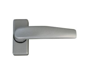 Juego de manillas con roseta rectangular reforzada. Fabricada en aluminio de alta calidad. 4 orificios de fijación. Cuadradillo de 8 mm.