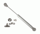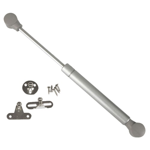 Compás de gas para puertas abatibles de muebles. Fabricado en acero y de polipropileno gris en sus extremos. Con función de apertura ascendente. La hoja queda posicionada a 80°, 90° o a 100° según el tamaño y peso de la misma. Resistencia de carga: 12 kg. Se incluyen soportes de fijación para madera y aluminio.