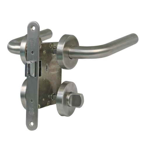 1 Juego de manillas modelo 4RX. 1 Muletilla modelo 3RX de acero inoxidable. 1 Picaporte modelo 4000 de acero inoxidable. Para puertas de carpintería de madera. Sobre encargo.