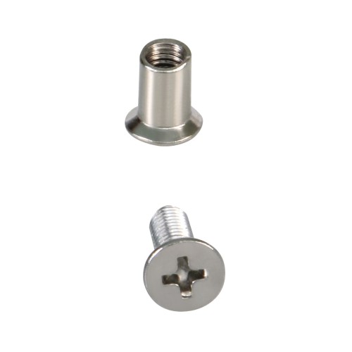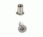 Tornillo en acero inoxidable 18/8. Casquillo en latón cromado. Para la fijación de los herrajes de sistemas de mamparas.