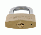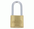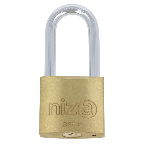 Candado en latón. Arco tratado de acero. Arco largo. Incluye 2 llaves. Llave en bruto modelo NIZA.