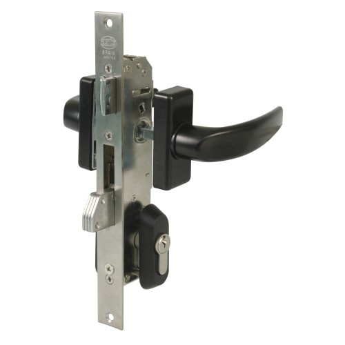 Kit formado por: 1 juego de manillas modelo Delta en negro. 1 cerradura metálica modelo 740-20 y 1 cilindro de serre ta modelo 9000-60 (25-25-10) mm latón cromado. Para puertas de carpintería metálica. Sobre encargo.