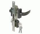 1 Juego de manillas modelo Delta en negro. 1 Cerradura metálica modelo 770 con entrada de 30 mm. 1 Cilindro de serreta modelo 9000-60 mm (25-25-10) de latón cromado. Para puertas de carpintería metálica. Sobre encargo.